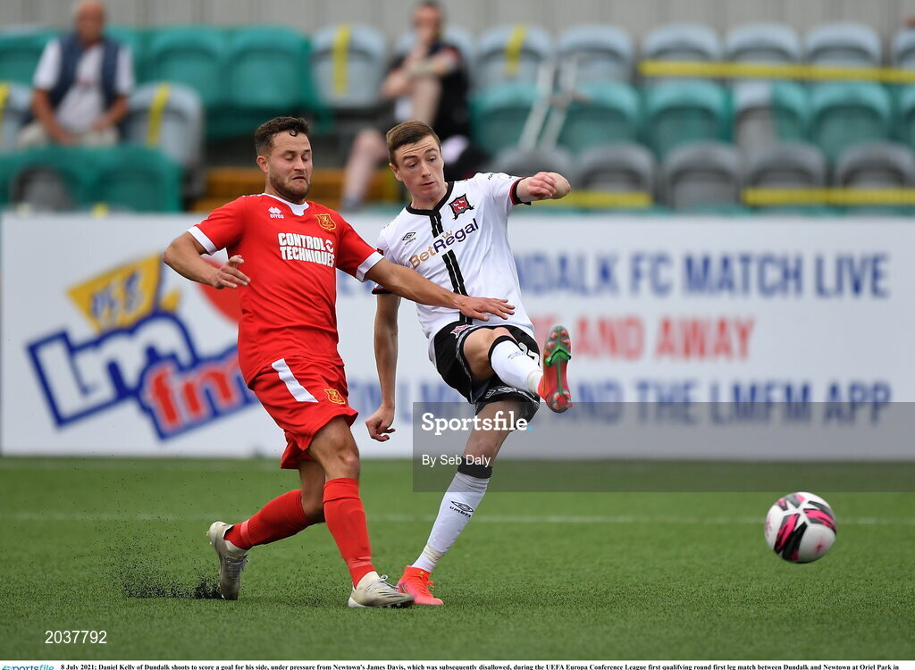 8 July 2021; Daniel Kelly of Dundalk shoots to score a goal for his side, under pressure from Newtown's James Davis, which was subsequently disallowed, during the UEFA Europa Conference League first qualifying round first leg match between Dundalk and Newtown at Oriel Park in Dundalk, Louth. Photo by Seb Daly/Sportsfile