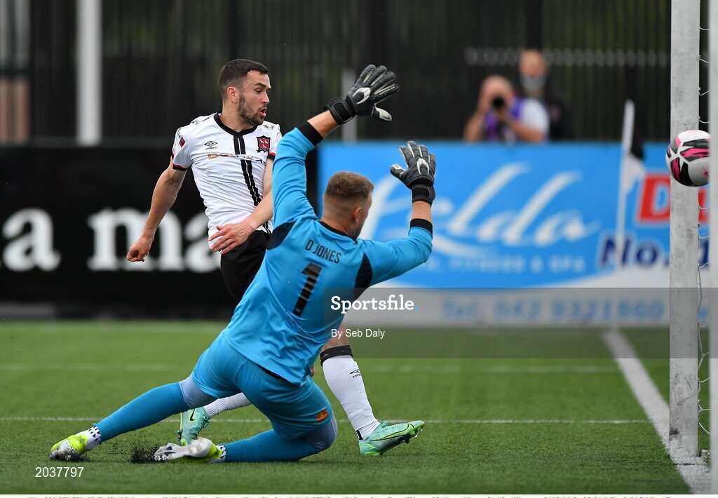 8 July 2021; Michael Duffy of Dundalk shoots to score his side's first goal, past Newtown goalkeeper Dave Jones, during the UEFA Europa Conference League first qualifying round first leg match between Dundalk and Newtown at Oriel Park in Dundalk, Louth. Photo by Seb Daly/Sportsfile