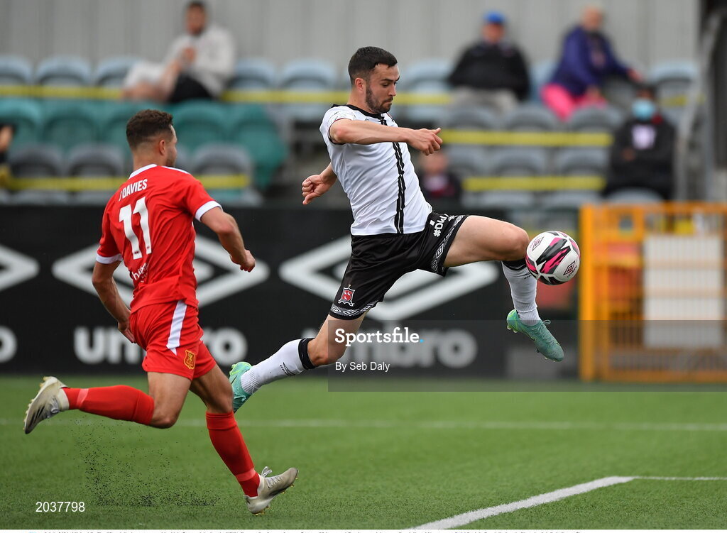 8 July 2021; Michael Duffy of Dundalk shoots to score his side's first goal during the UEFA Europa Conference League first qualifying round first leg match between Dundalk and Newtown at Oriel Park in Dundalk, Louth. Photo by Seb Daly/Sportsfile