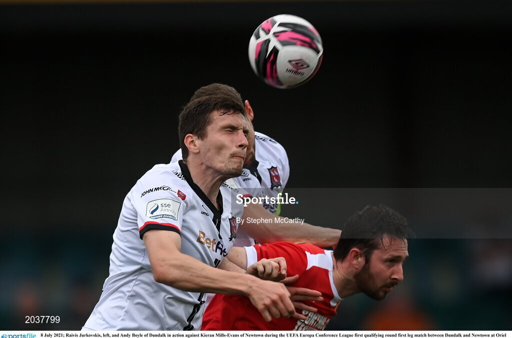 8 July 2021; Raivis Jurkovskis, left, and Andy Boyle of Dundalk in action against Kieran Mills-Evans of Newtown during the UEFA Europa Conference League first qualifying round first leg match between Dundalk and Newtown at Oriel Park in Dundalk, Louth. Photo by Stephen McCarthy/Sportsfile