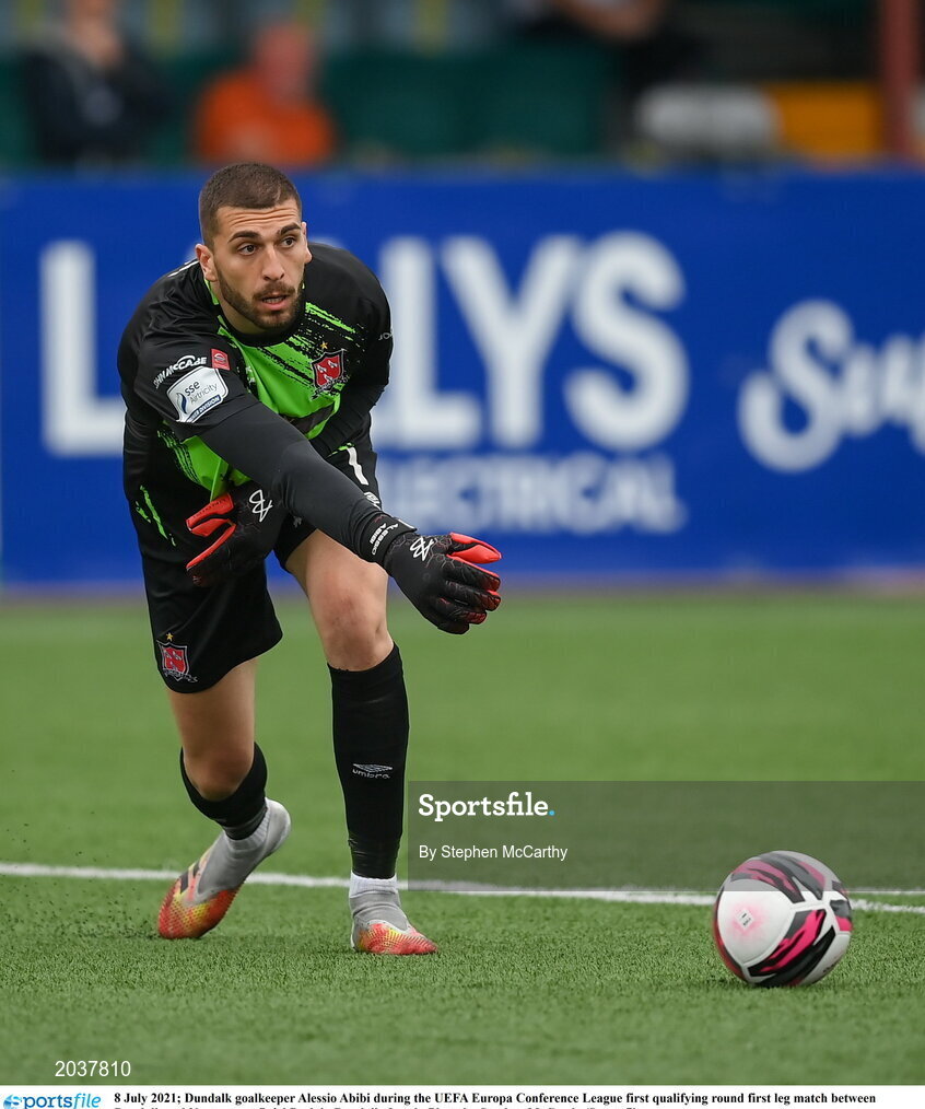 8 July 2021; Dundalk goalkeeper Alessio Abibi during the UEFA Europa Conference League first qualifying round first leg match between Dundalk and Newtown at Oriel Park in Dundalk, Louth. Photo by Stephen McCarthy/Sportsfile