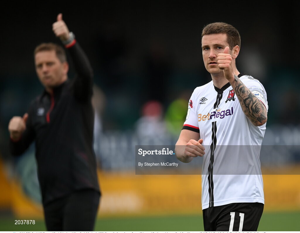 8 July 2021; Patrick McEleney and Dundalk head coach Vinny Perth following the UEFA Europa Conference League first qualifying round first leg match between Dundalk and Newtown at Oriel Park in Dundalk, Louth. Photo by Stephen McCarthy/Sportsfile