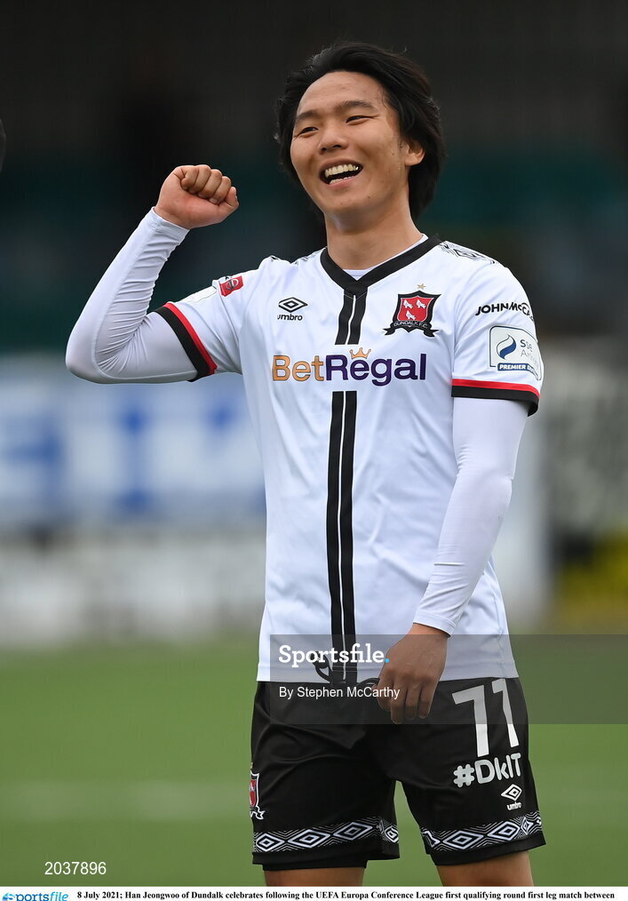 8 July 2021; Han Jeongwoo of Dundalk celebrates following the UEFA Europa Conference League first qualifying round first leg match between Dundalk and Newtown at Oriel Park in Dundalk, Louth. Photo by Stephen McCarthy/Sportsfile