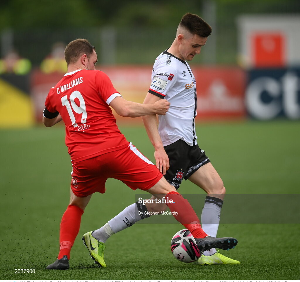 8 July 2021; Darragh Leahy of Dundalk in action against Craig Williams of Newtown during the UEFA Europa Conference League first qualifying round first leg match between Dundalk and Newtown at Oriel Park in Dundalk, Louth. Photo by Stephen McCarthy/Sportsfile