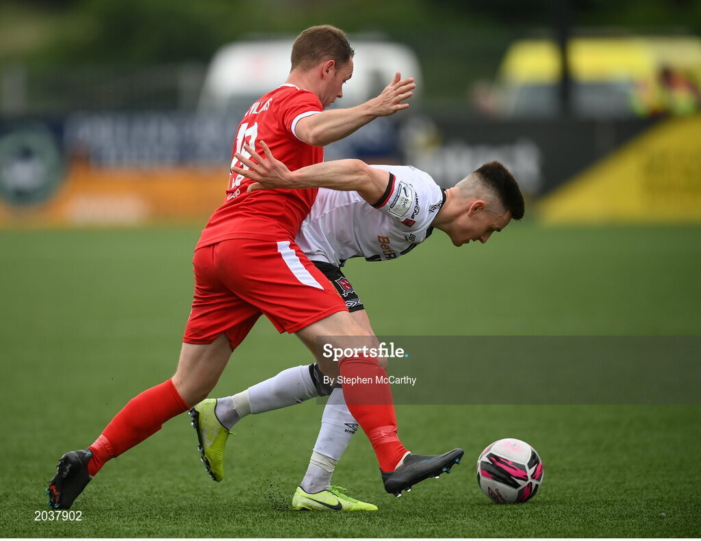 8 July 2021; Darragh Leahy of Dundalk in action against Craig Williams of Newtown during the UEFA Europa Conference League first qualifying round first leg match between Dundalk and Newtown at Oriel Park in Dundalk, Louth. Photo by Stephen McCarthy/Sportsfile