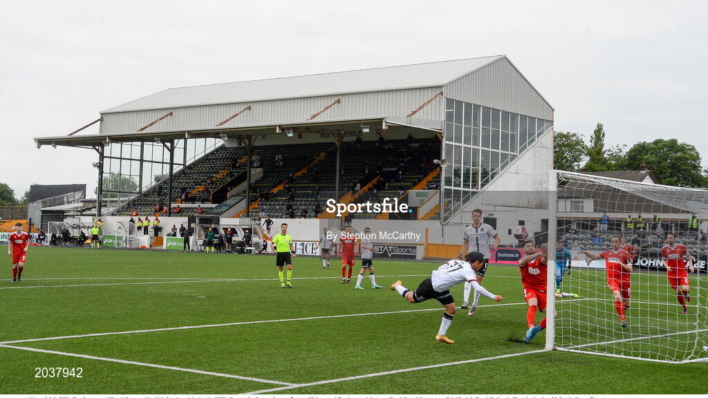 8 July 2021; Han Jeongwoo of Dundalk scores his side's fourth goal during the UEFA Europa Conference League first qualifying round first leg match between Dundalk and Newtown at Oriel Park in Dundalk, Louth. Photo by Stephen McCarthy/Sportsfile
