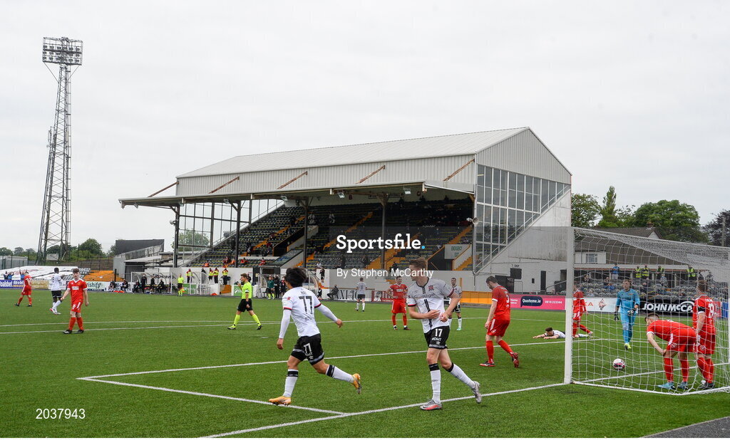 8 July 2021; Han Jeongwoo, 77, of Dundalk celebrates after scoring his side's fourth goal, with team-mate Ole Erik Midtskogen, during the UEFA Europa Conference League first qualifying round first leg match between Dundalk and Newtown at Oriel Park in Dundalk, Louth. Photo by Stephen McCarthy/Sportsfile