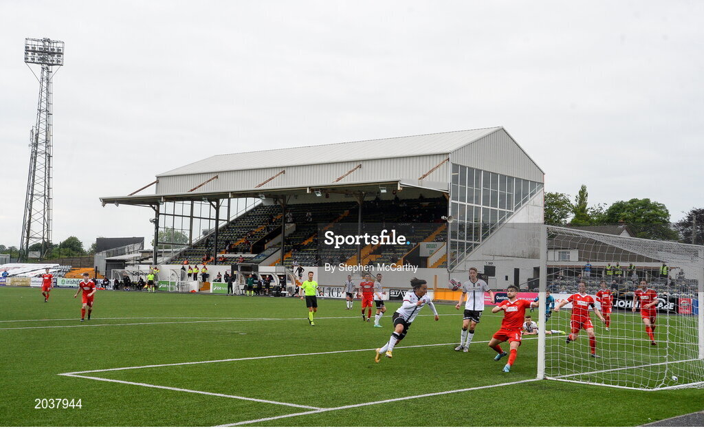 8 July 2021; Han Jeongwoo of Dundalk scores his side's fourth goal during the UEFA Europa Conference League first qualifying round first leg match between Dundalk and Newtown at Oriel Park in Dundalk, Louth. Photo by Stephen McCarthy/Sportsfile