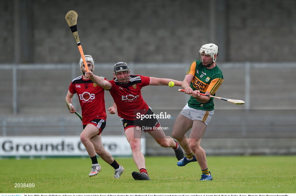 26 June 2021; Barry O’Mahony of Kerry in action against Chris Egan of Down during the Joe McDonagh Cup Round 1 match between Kerry and Down at Austin Stack Park in Tralee, Kerry. Photo by Daire Brennan/Sportsfile