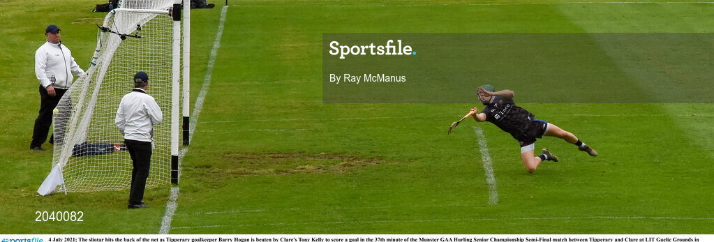 4 July 2021; The sliotar hits the back of the net as Tipperary goalkeeper Barry Hogan is beaten by Clare's Tony Kelly to score a goal in the 37th minute of the Munster GAA Hurling Senior Championship Semi-Final match between Tipperary and Clare at LIT Gaelic Grounds in Limerick. Photo by Ray McManus/Sportsfile