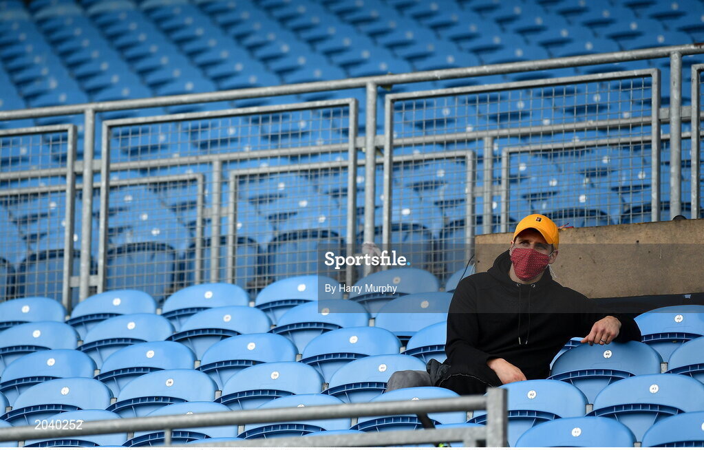 11 July 2021; Injured Mayo footballer Lee Keegan looks on before the Connacht GAA Senior Football Championship Semi-Final match between Leitrim and Mayo at Elverys MacHale Park in Castlebar, Mayo. Photo by Harry Murphy/Sportsfile