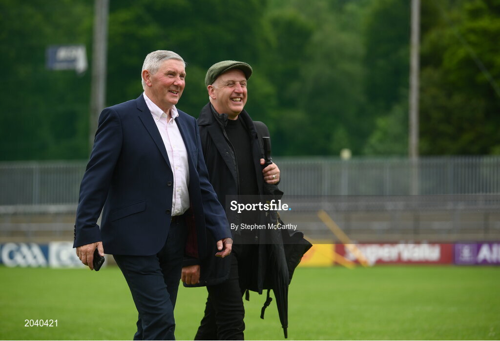 11 July 2021; Former Donegal manager and player Martin McHugh, left, and BBC Sport Northern Ireland's Mark Sidebottom before the Ulster GAA Football Senior Championship Quarter-Final match between Derry and Donegal at Páirc MacCumhaill in Ballybofey, Donegal. Photo by Stephen McCarthy/Sportsfile