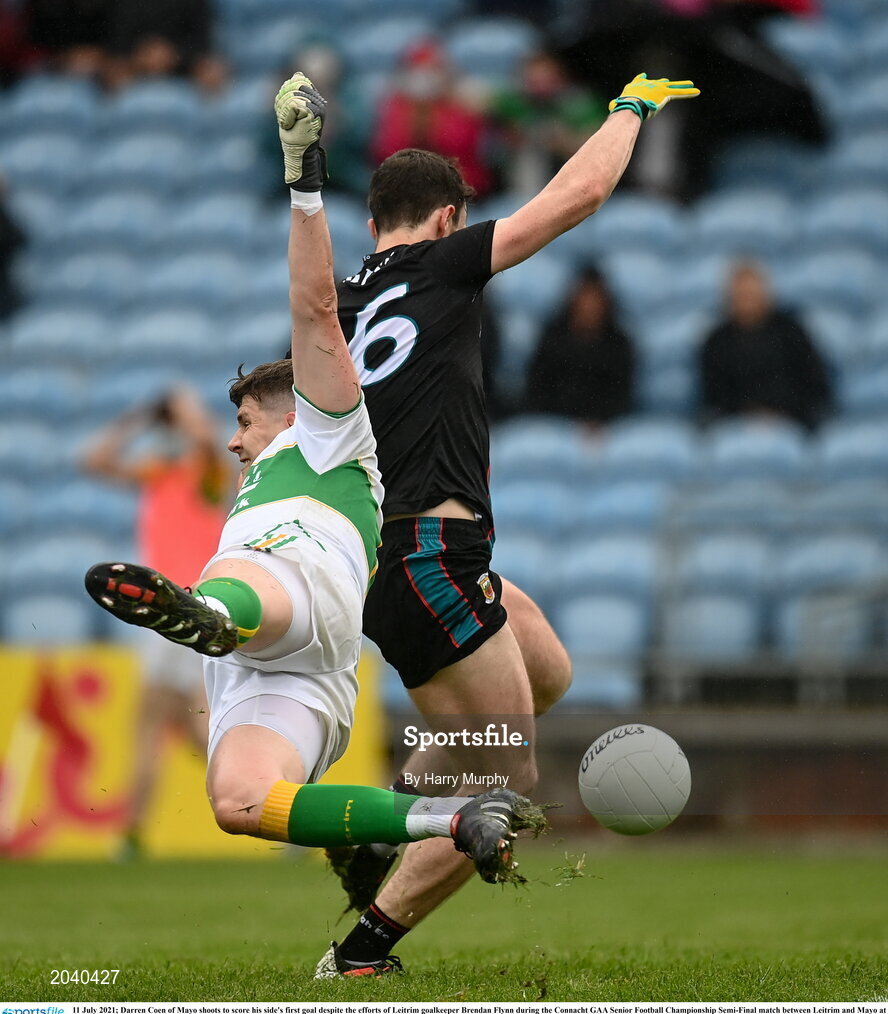 11 July 2021; Darren Coen of Mayo shoots to score his side's first goal despite the efforts of Leitrim goalkeeper Brendan Flynn during the Connacht GAA Senior Football Championship Semi-Final match between Leitrim and Mayo at Elverys MacHale Park in Castlebar, Mayo. Photo by Harry Murphy/Sportsfile