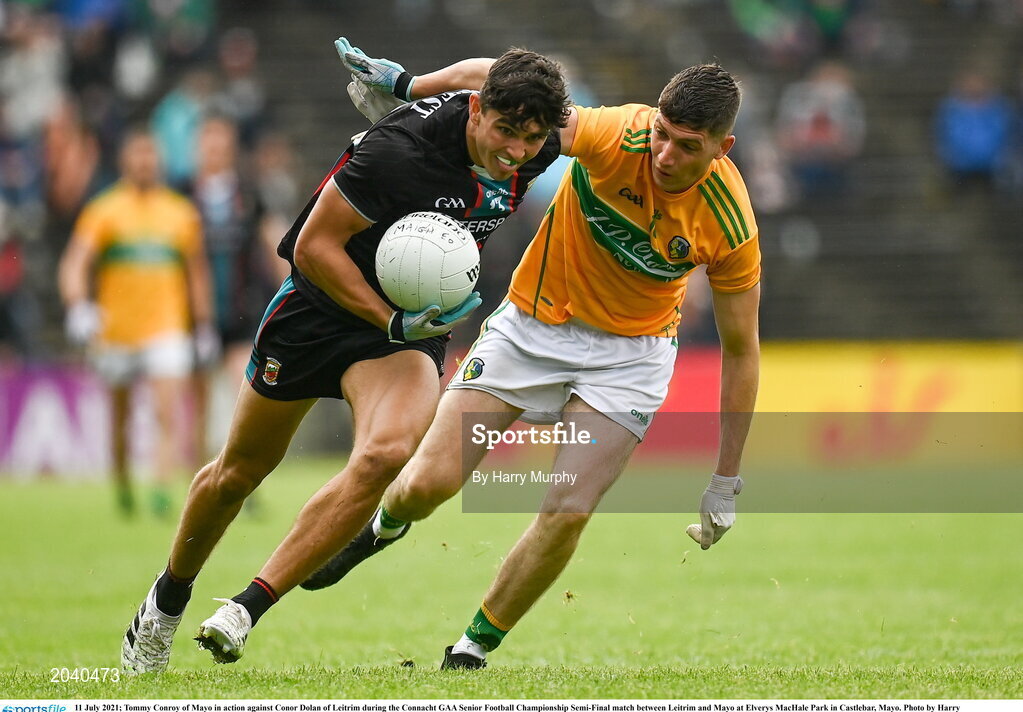11 July 2021; Tommy Conroy of Mayo in action against Conor Dolan of Leitrim during the Connacht GAA Senior Football Championship Semi-Final match between Leitrim and Mayo at Elverys MacHale Park in Castlebar, Mayo. Photo by Harry Murphy/Sportsfile