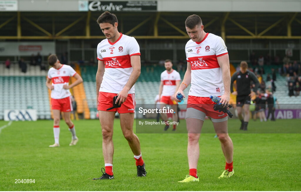 11 July 2021; Dejcted Chrissy McKaigue, left, and Gareth McKinless of Derry following the Ulster GAA Football Senior Championship Quarter-Final match between Derry and Donegal at Páirc MacCumhaill in Ballybofey, Donegal. Photo by Stephen McCarthy/Sportsfile
