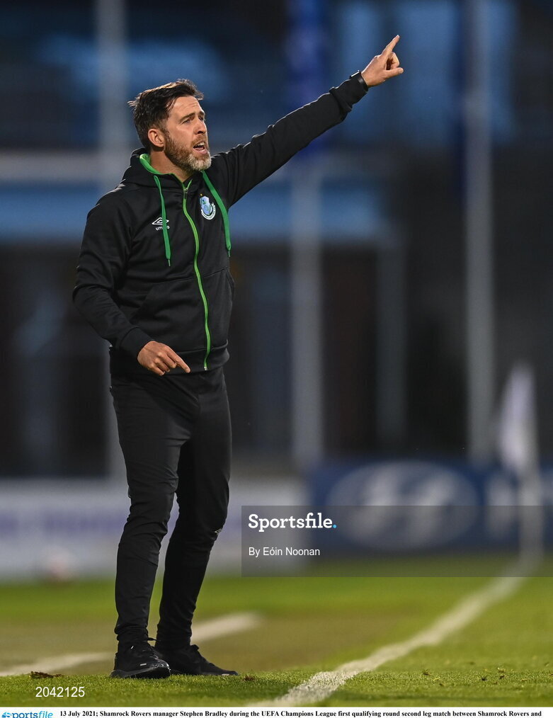 13 July 2021; Shamrock Rovers manager Stephen Bradley during the UEFA Champions League first qualifying round second leg match between Shamrock Rovers and Slovan Bratislava at Tallaght Stadium in Dublin. Photo by Eóin Noonan/Sportsfile