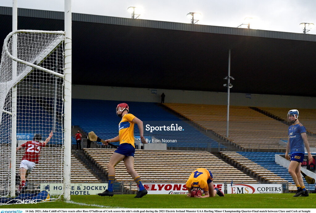14 July 2021; John Cahill of Clare, 4, reacts after Ross O’Sullivan of Cork scores his side's sixth goal during the 2021 Electric Ireland Munster GAA Hurling Minor Championship Quarter-Final match between Clare and Cork at Semple Stadium in Thurles, Tipperary. Photo by Eóin Noonan/Sportsfile