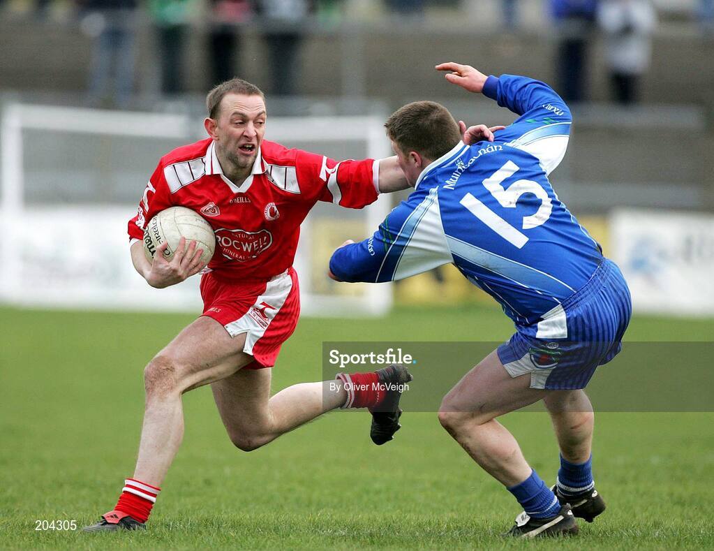 19 March 2006; Gerard Cavlan, Tyrone, is tackled by Rory Woods, Monaghan. Allianz National Football League, Division 1A, Round 5, Tyrone v Monaghan, Healy Park, Omagh, Co. Tyrone. Picture credit: Oliver McVeigh / SPORTSFILE