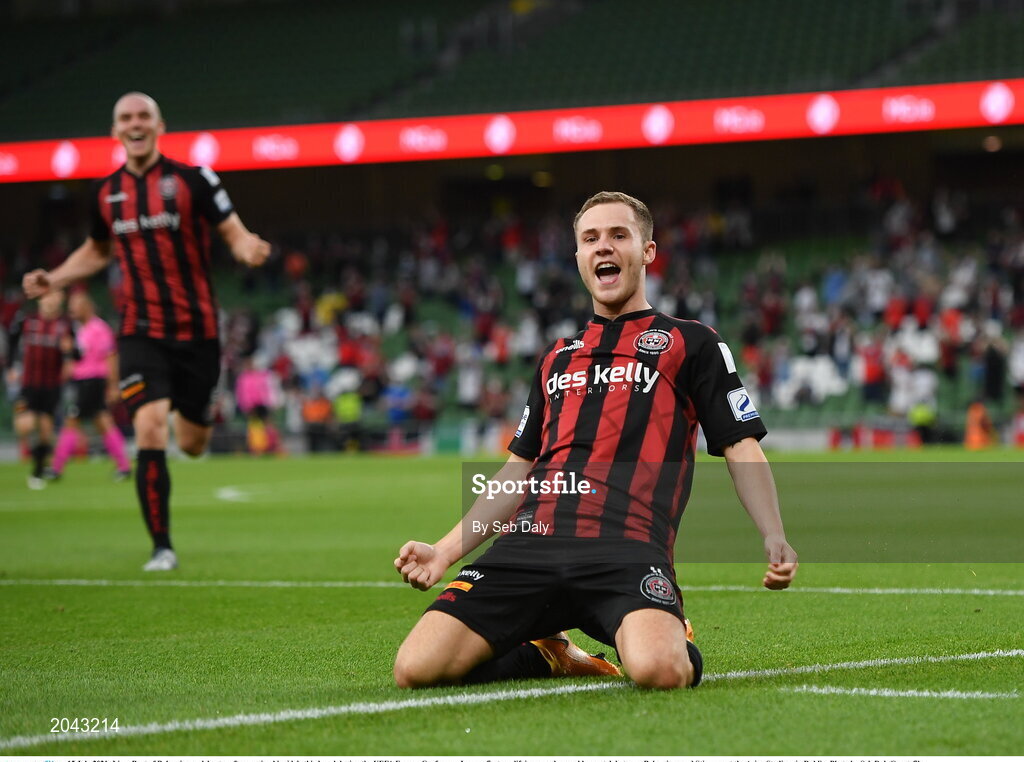 15 July 2021; Liam Burt of Bohemians celebrates after scoring his side's third goal during the UEFA Europa Conference League first qualifying round second leg match between Bohemians and Stjarnan at the Aviva Stadium in Dublin. Photo by Seb Daly/Sportsfile