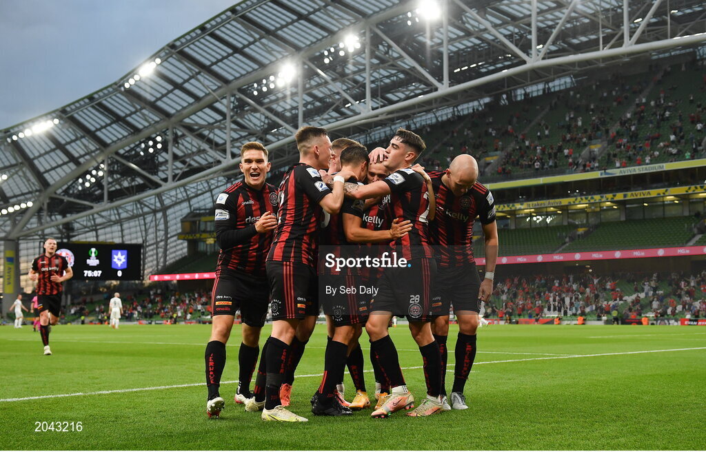 15 July 2021; Bohemians players celebrate their side's third goal, scored by Liam Burt, during the UEFA Europa Conference League first qualifying round second leg match between Bohemians and Stjarnan at the Aviva Stadium in Dublin. Photo by Seb Daly/Sportsfile