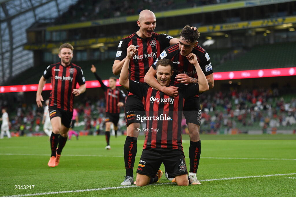 15 July 2021; Liam Burt of Bohemians is congratulated by team-mates Georgie Kelly, left, and Dawson Devoy after scoring their side's third goal during the UEFA Europa Conference League first qualifying round second leg match between Bohemians and Stjarnan at the Aviva Stadium in Dublin. Photo by Seb Daly/Sportsfile