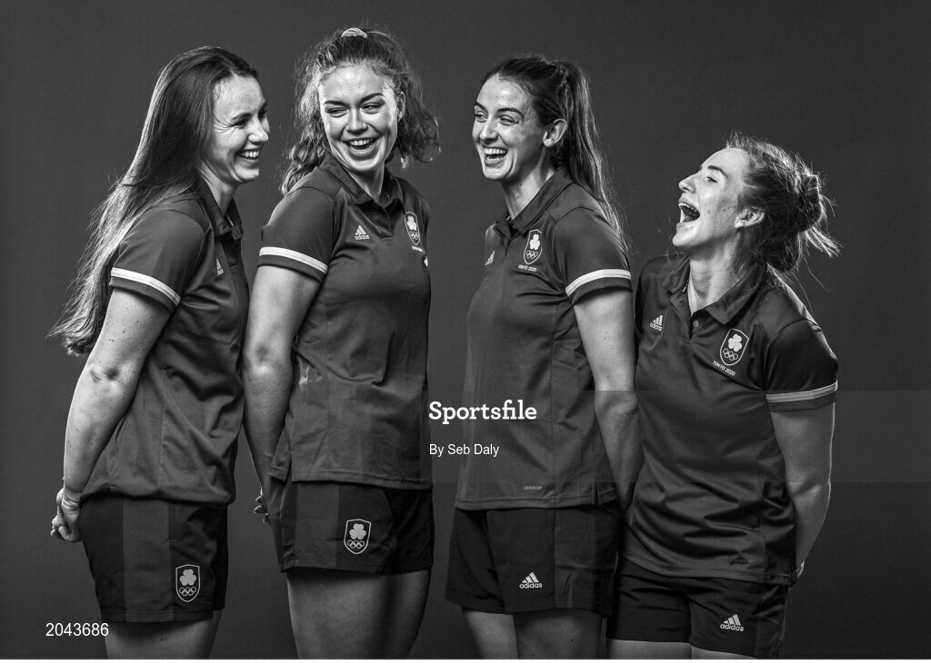 18 June 2021; (EDITOR'S NOTE; Image has been converted to black & white) Rowers, from left, Aifric Keogh, Eimear Lambe, Fiona Murtagh and Emily Hegarty during a Tokyo 2020 Team Ireland Announcement for Rowing at the National Rowing Centre in Cork. Photo by Seb Daly/Sportsfile