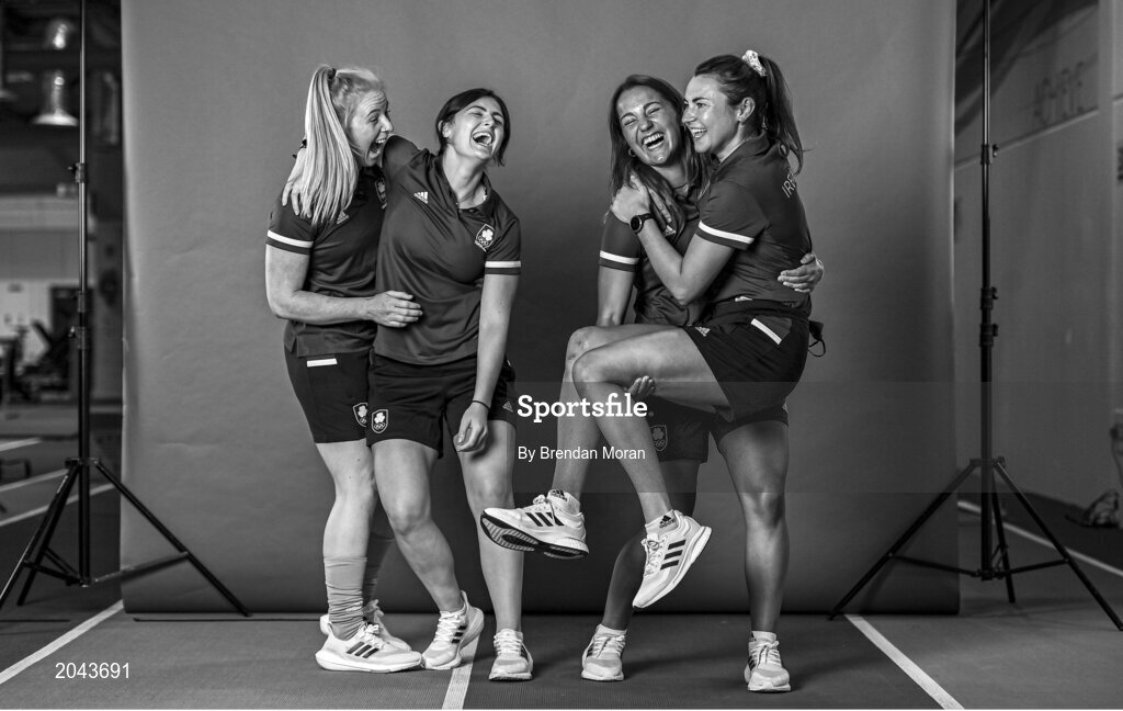 29 June 2021; (EDITOR'S NOTE; Image has been converted to black & white) The Team Ireland Hockey members from left, Ayeisha McFerran, Roisin Upton, Lena Tice and Deirdre Duke during a Tokyo 2020 Team Ireland Announcement for Hockey in the Sport Ireland Institute at the Sport Ireland Campus in Dublin. Photo by Brendan Moran/Sportsfile