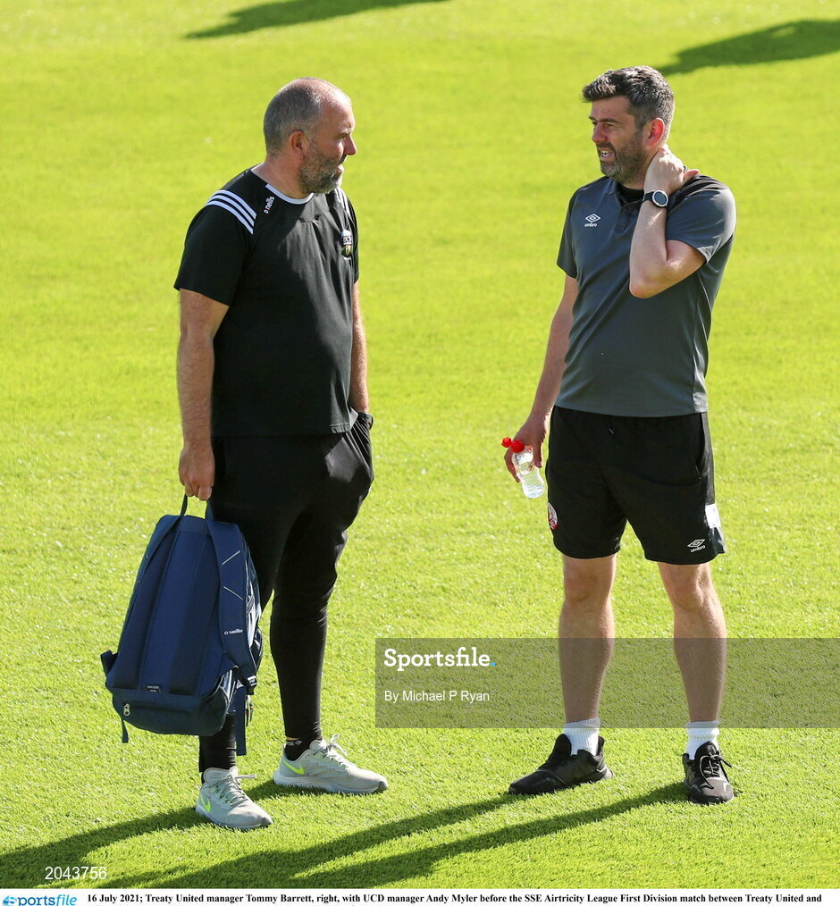 16 July 2021; Treaty United manager Tommy Barrett, right, with UCD manager Andy Myler before the SSE Airtricity League First Division match between Treaty United and UCD at Market's Field in Limerick. Photo by Michael P Ryan/Sportsfile