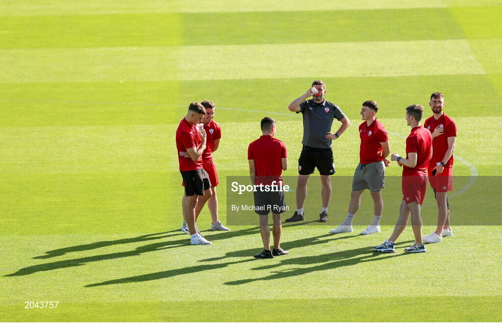 16 July 2021; Treaty United manager Tommy Barrett, centre, with his players before the SSE Airtricity League First Division match between Treaty United and UCD at Market's Field in Limerick. Photo by Michael P Ryan/Sportsfile