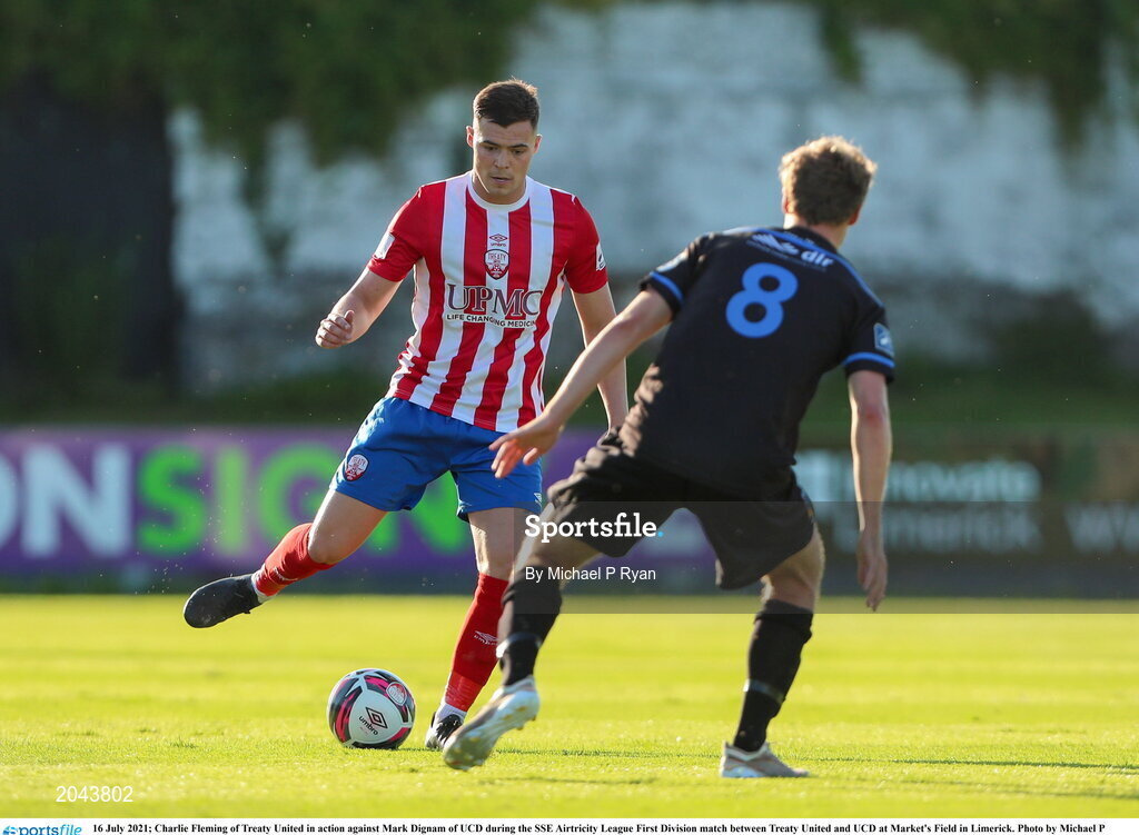 16 July 2021; Charlie Fleming of Treaty United in action against Mark Dignam of UCD during the SSE Airtricity League First Division match between Treaty United and UCD at Market's Field in Limerick. Photo by Michael P Ryan/Sportsfile