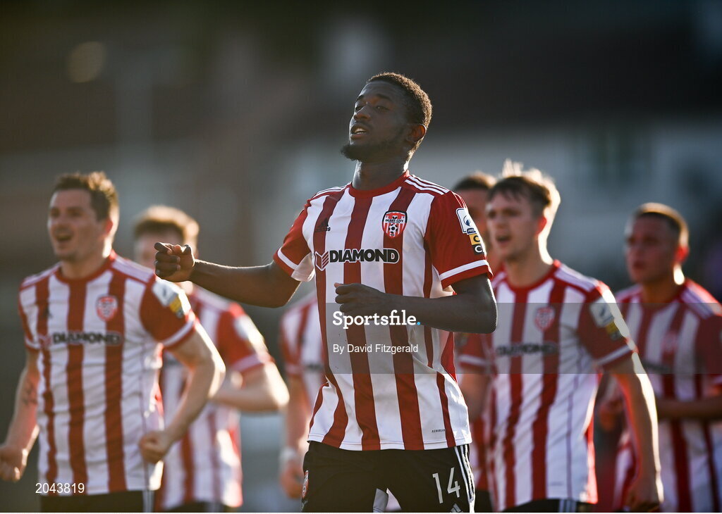 16 July 2021; Junior Ogedi-Uzokwe of Derry City celebrates after scoring his side's second goal during the SSE Airtricity League Premier Division match between Derry City and Shamrock Rovers at the Ryan McBride Brandywell Stadium in Derry. Photo by David Fitzgerald/Sportsfile
