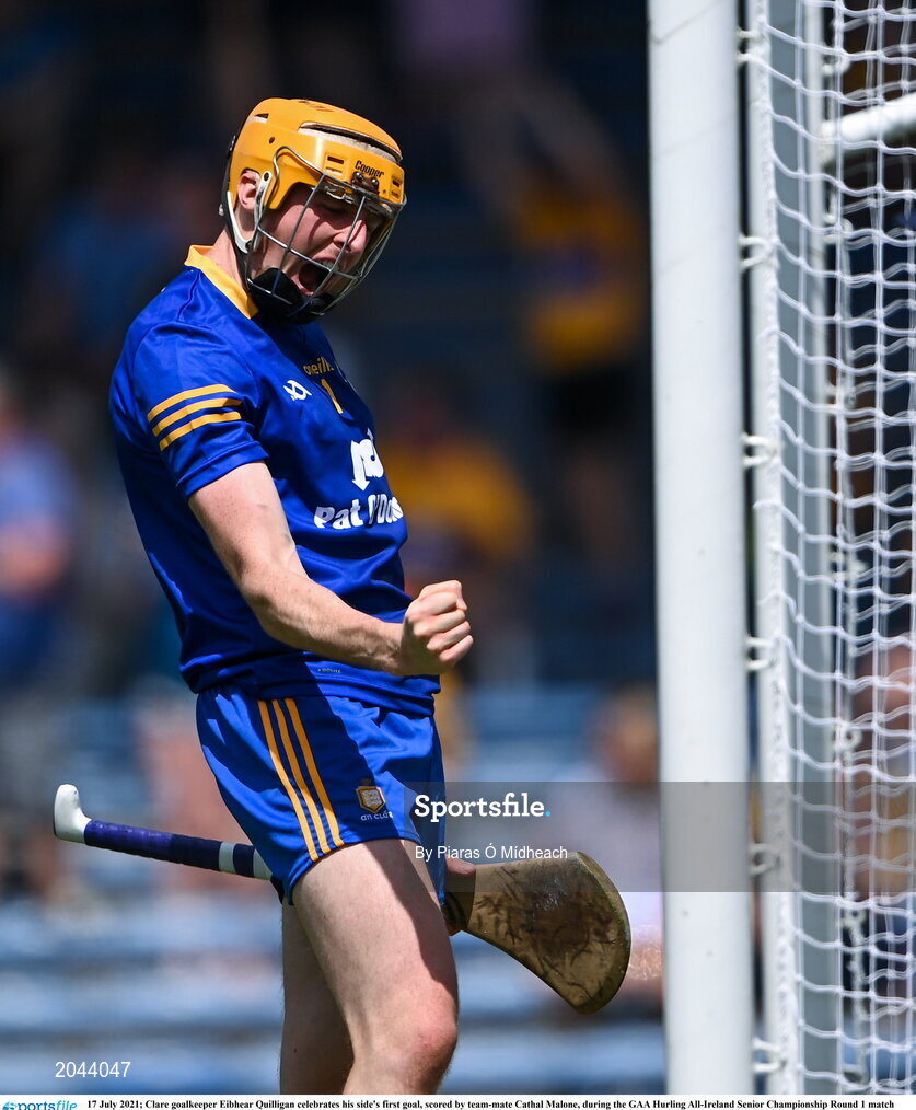 17 July 2021; Clare goalkeeper Eibhear Quilligan celebrates his side's first goal, scored by team-mate Cathal Malone, during the GAA Hurling All-Ireland Senior Championship Round 1 match between Clare and Wexford at Semple Stadium in Thurles, Tipperary. Photo by Piaras Ó Mídheach/Sportsfile