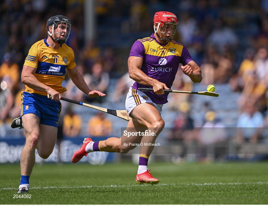 17 July 2021; Lee Chin of Wexford is chased by Tony Kelly of Clare during the GAA Hurling All-Ireland Senior Championship Round 1 match between Clare and Wexford at Semple Stadium in Thurles, Tipperary. Photo by Piaras Ó Mídheach/Sportsfile