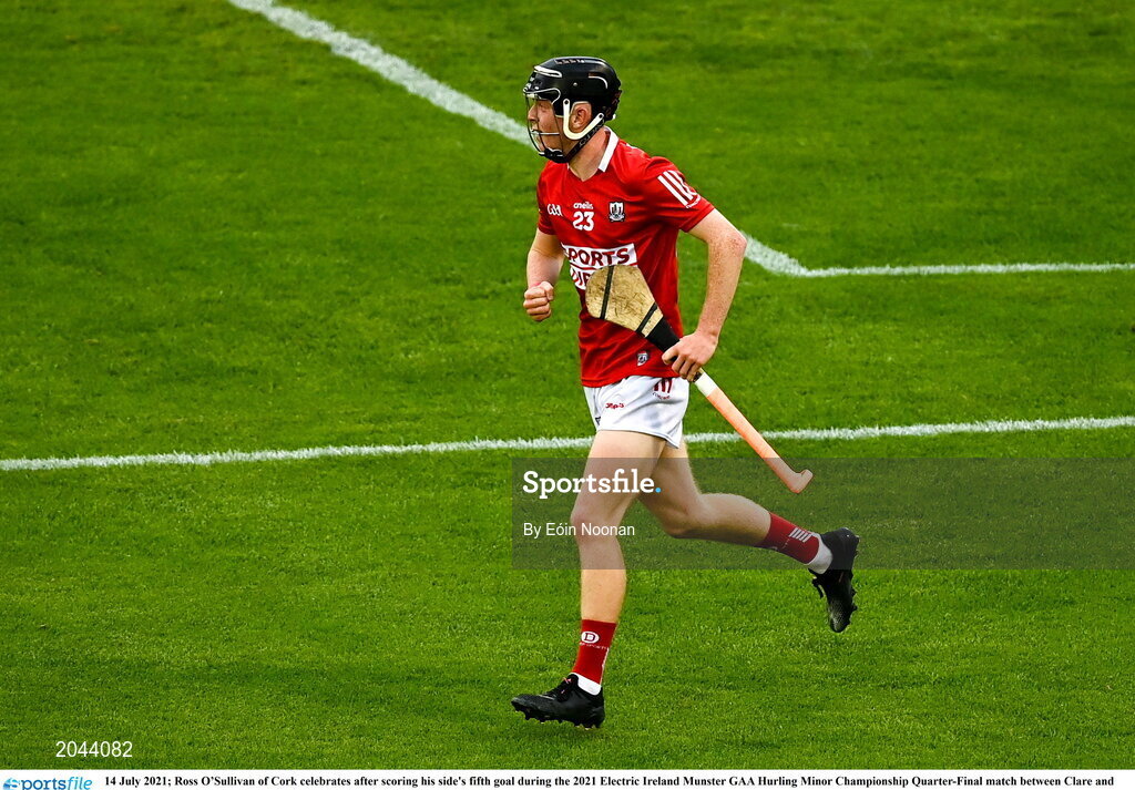 14 July 2021; Ross O’Sullivan of Cork celebrates after scoring his side's fifth goal during the 2021 Electric Ireland Munster GAA Hurling Minor Championship Quarter-Final match between Clare and Cork at Semple Stadium in Thurles, Tipperary. Photo by Eóin Noonan/Sportsfile