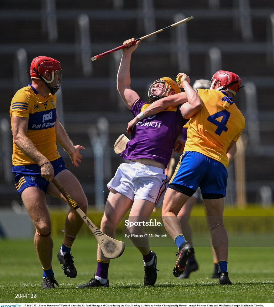 17 July 2021; Simon Donohoe of Wexford is tackled by Paul Flanagan of Clare during the GAA Hurling All-Ireland Senior Championship Round 1 match between Clare and Wexford at Semple Stadium in Thurles, Tipperary. Photo by Piaras Ó Mídheach/Sportsfile