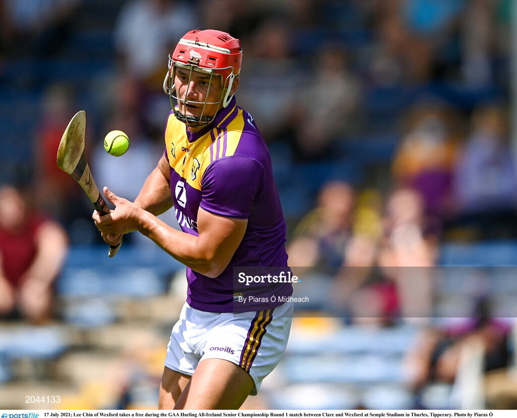 17 July 2021; Lee Chin of Wexford takes a free during the GAA Hurling All-Ireland Senior Championship Round 1 match between Clare and Wexford at Semple Stadium in Thurles, Tipperary. Photo by Piaras Ó Mídheach/Sportsfile
