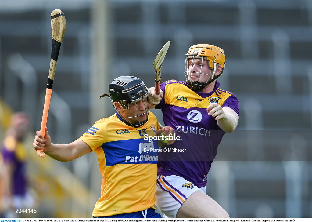17 July 2021; David Reidy of Clare is tackled by Simon Donohoe of Wexford during the GAA Hurling All-Ireland Senior Championship Round 1 match between Clare and Wexford at Semple Stadium in Thurles, Tipperary. Photo by Piaras Ó Mídheach/Sportsfile