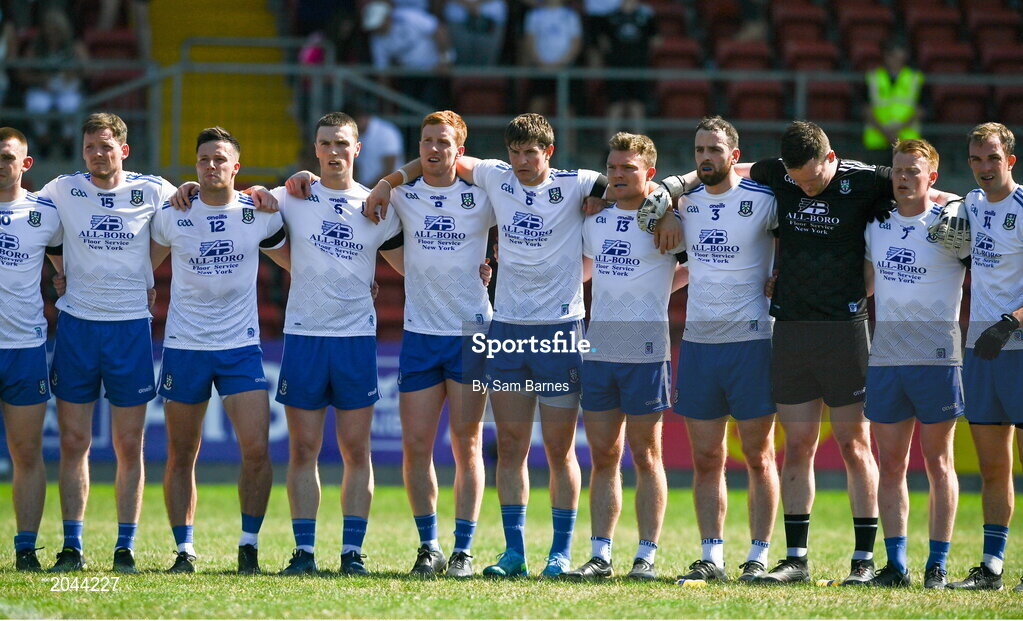 17 July 2021; The Monaghan team stand for a moments silence in memory of Monaghan Under-20 captain Brendan Óg O Dufaigh before the the Ulster GAA Football Senior Championship Semi-Final match between Armagh and Monaghan at Páirc Esler in Newry, Down. Photo by Sam Barnes/Sportsfile