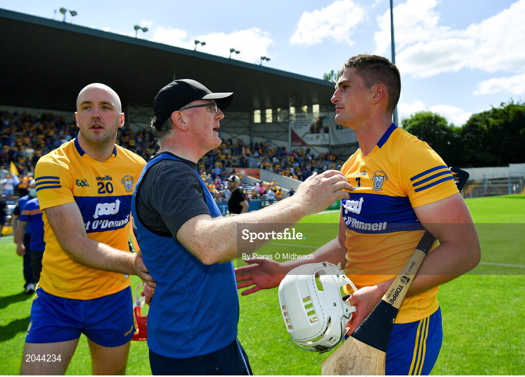 17 July 2021; Clare manager Brian Lohan with Conor Cleary after their side's victory in the GAA Hurling All-Ireland Senior Championship Round 1 match between Clare and Wexford at Semple Stadium in Thurles, Tipperary. Photo by Piaras Ó Mídheach/Sportsfile