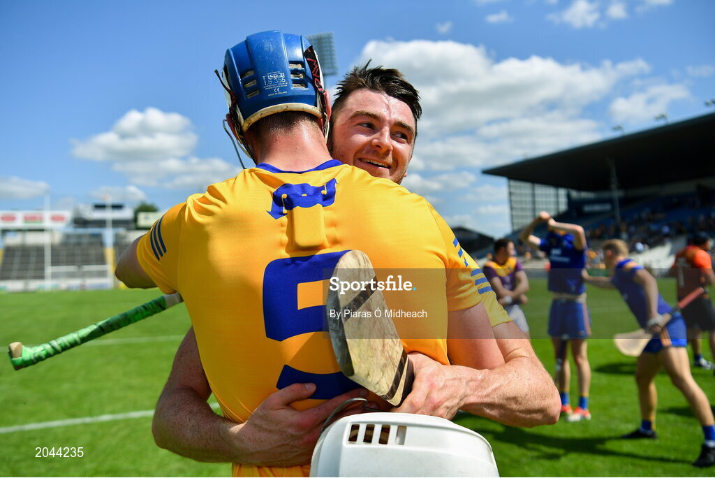 17 July 2021; Ryan Taylor of Clare, behind, celebrates with team-mate Diarmuid Ryan after their side's victory in the GAA Hurling All-Ireland Senior Championship Round 1 match between Clare and Wexford at Semple Stadium in Thurles, Tipperary. Photo by Piaras Ó Mídheach/Sportsfile