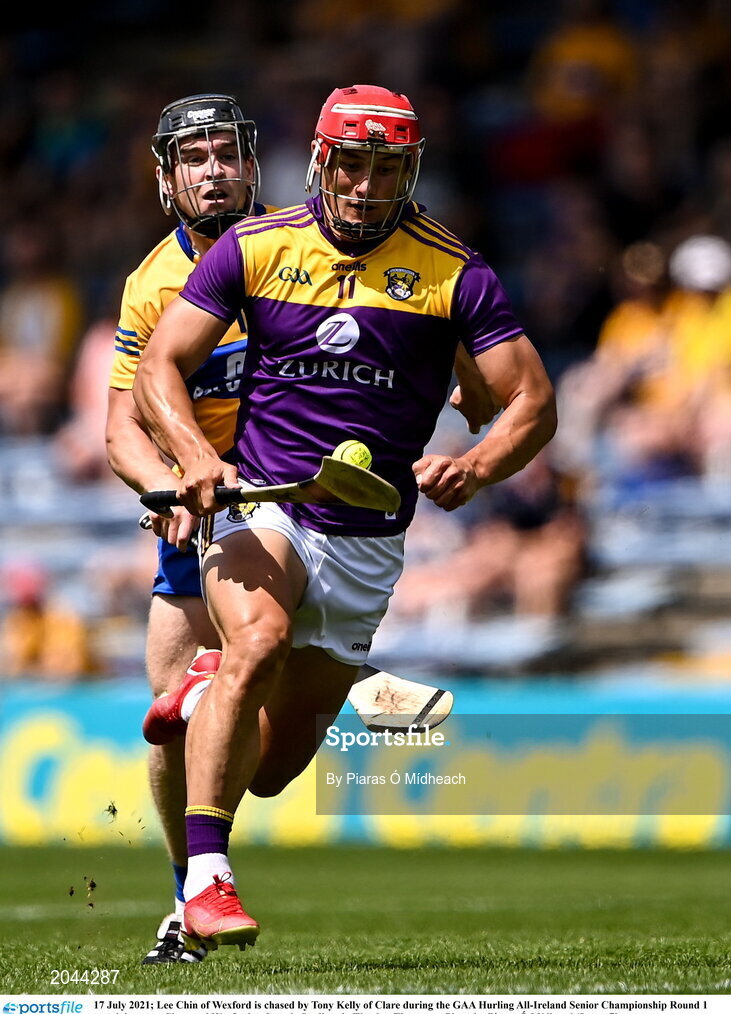 17 July 2021; Lee Chin of Wexford is chased by Tony Kelly of Clare during the GAA Hurling All-Ireland Senior Championship Round 1 match between Clare and Wexford at Semple Stadium in Thurles, Tipperary. Photo by Piaras Ó Mídheach/Sportsfile