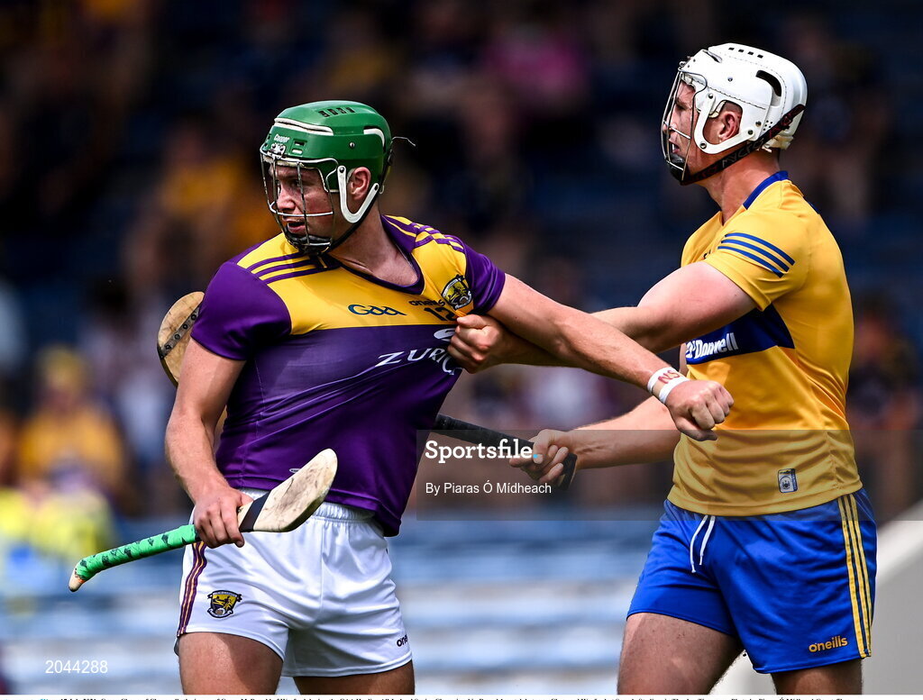 17 July 2021; Conor Cleary of Clare pulls the jersey of Conor McDonald of Wexford during the GAA Hurling All-Ireland Senior Championship Round 1 match between Clare and Wexford at Semple Stadium in Thurles, Tipperary. Photo by Piaras Ó Mídheach/Sportsfile