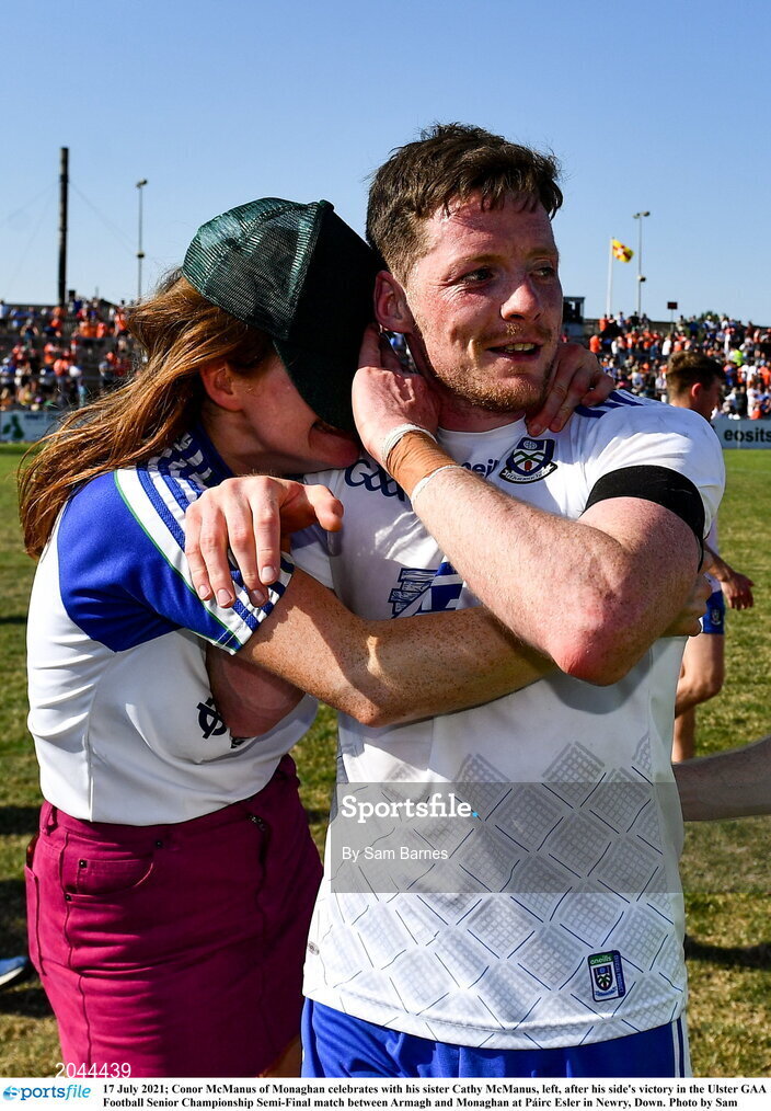 17 July 2021; Conor McManus of Monaghan celebrates with his sister Cathy McManus, left, after his side's victory in the Ulster GAA Football Senior Championship Semi-Final match between Armagh and Monaghan at Páirc Esler in Newry, Down. Photo by Sam Barnes/Sportsfile