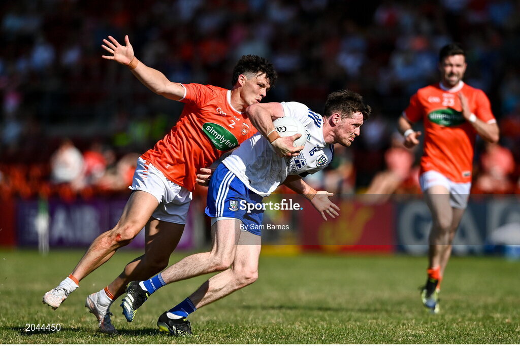 17 July 2021; Conor McManus of Monaghan in action against James Morgan of Armagh during the Ulster GAA Football Senior Championship Semi-Final match between Armagh and Monaghan at Páirc Esler in Newry, Down. Photo by Sam Barnes/Sportsfile