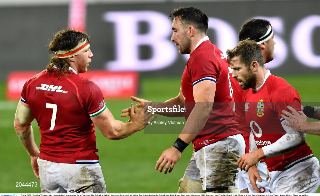 17 July 2021; Hamish Watson, left, congratulates team-mate Jack Conan of The British & Irish Lions after he scored his side's fourth try during the British and Irish Lions Tour match between DHL Stormers and The British & Irish Lions at Cape Town Stadium in Cape Town, South Africa. Photo by Ashley Vlotman/Sportsfile