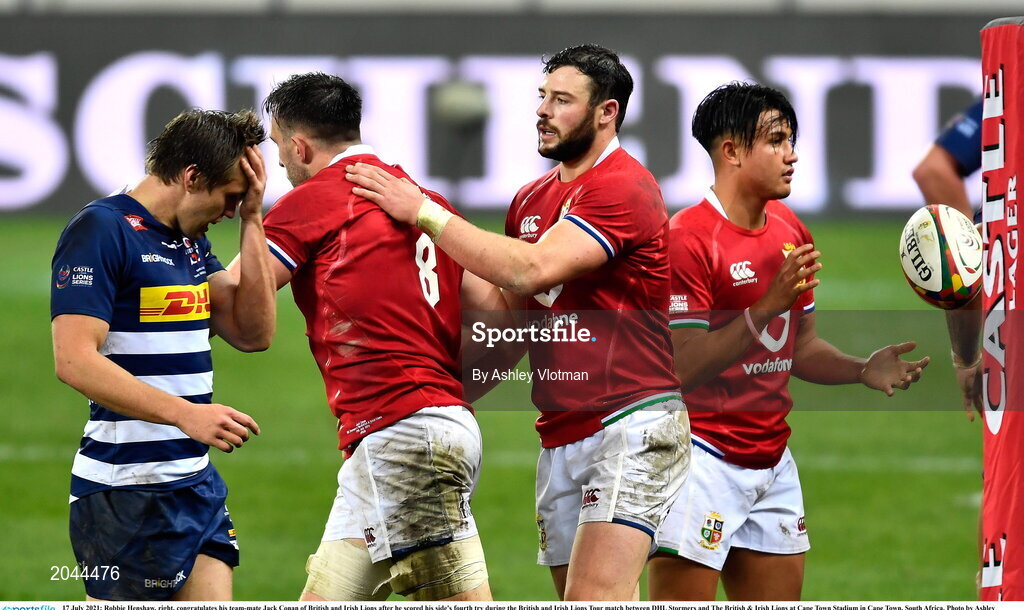 17 July 2021; Robbie Henshaw, right, congratulates his team-mate Jack Conan of British and Irish Lions after he scored his side's fourth try during the British and Irish Lions Tour match between DHL Stormers and The British & Irish Lions at Cape Town Stadium in Cape Town, South Africa. Photo by Ashley Vlotman/Sportsfile