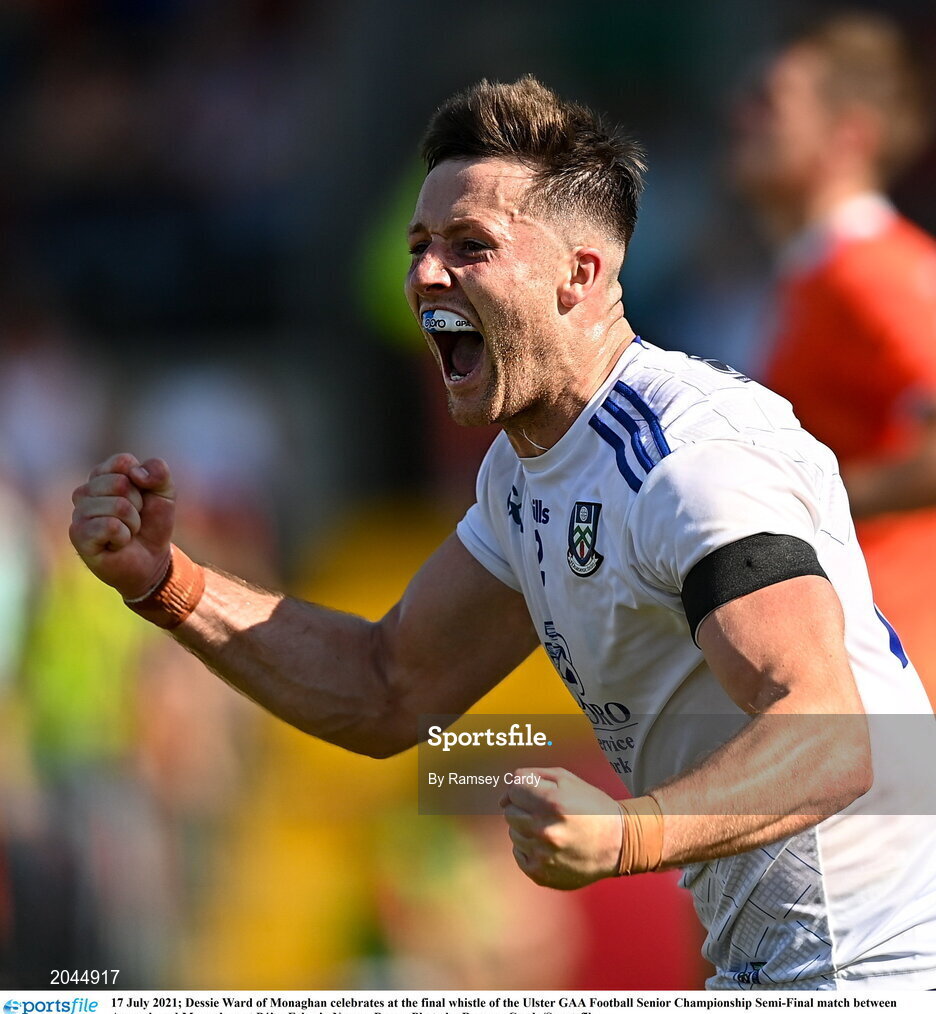 17 July 2021; Dessie Ward of Monaghan celebrates at the final whistle of the Ulster GAA Football Senior Championship Semi-Final match between Armagh and Monaghan at Páirc Esler in Newry, Down. Photo by Ramsey Cardy/Sportsfile