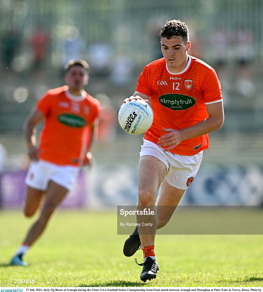 17 July 2021; Jarly Óg Burns of Armagh during the Ulster GAA Football Senior Championship Semi-Final match between Armagh and Monaghan at Páirc Esler in Newry, Down. Photo by Ramsey Cardy/Sportsfile