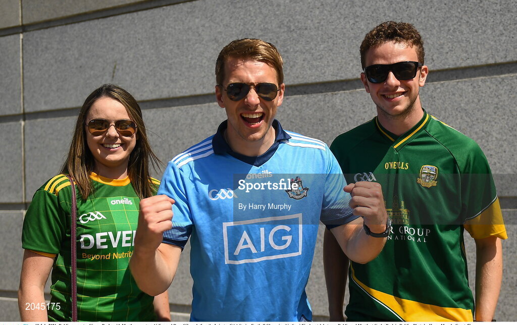 18 July 2021; Dublin supporter Ciaran Burke with Meath supporters Aisling and Rory Gibney before the Leinster GAA Senior Football Championship Semi-Final match between Dublin and Meath at Croke Park in Dublin. Photo by Harry Murphy/Sportsfile