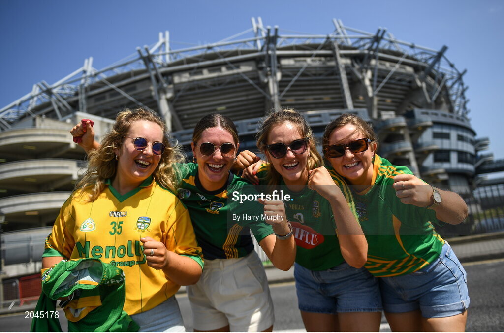 18 July 2021; Meath supporters, from left, Tara Canny, Kate Eakins, Aisling O'Rourke and Laura Gordon before the Leinster GAA Senior Football Championship Semi-Final match between Dublin and Meath at Croke Park in Dublin. Photo by Harry Murphy/Sportsfile